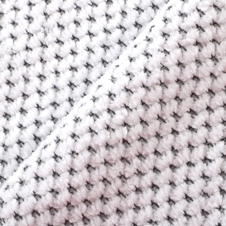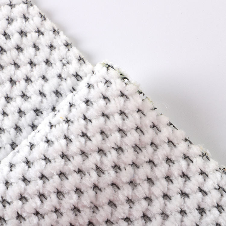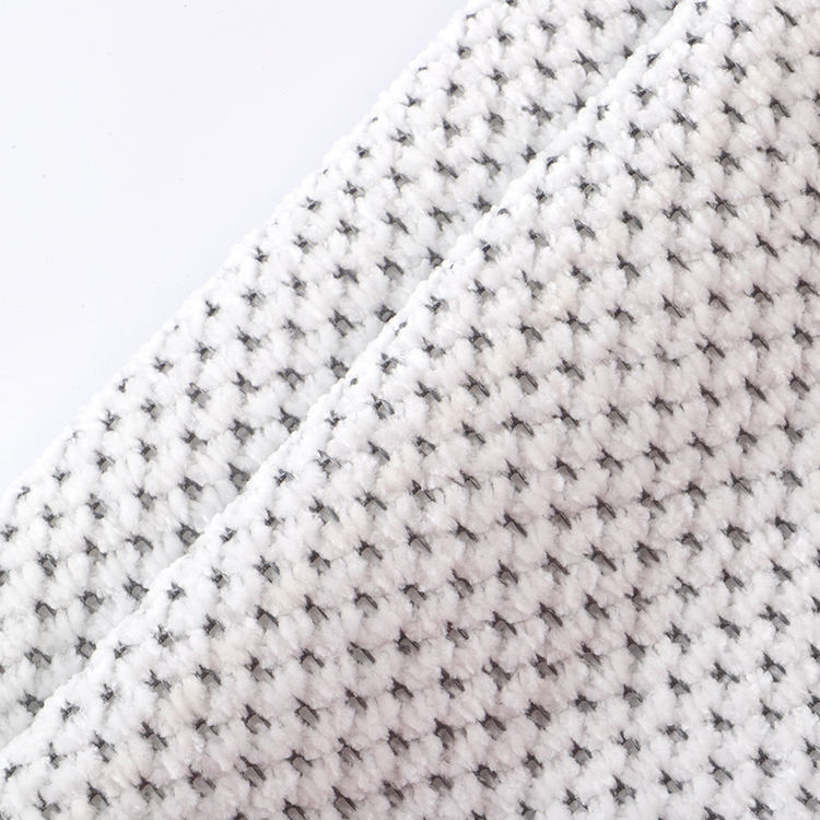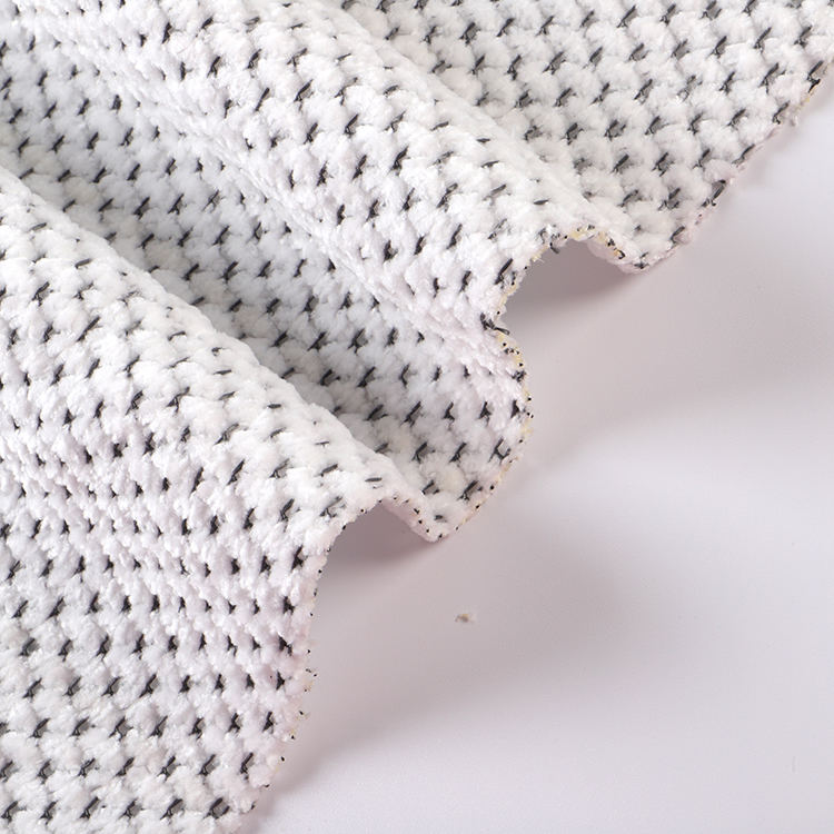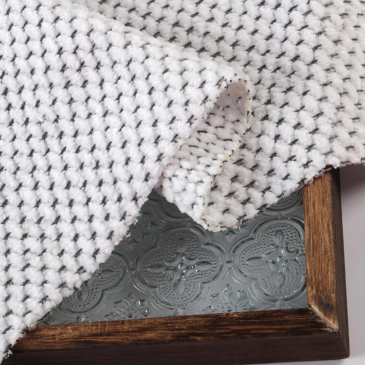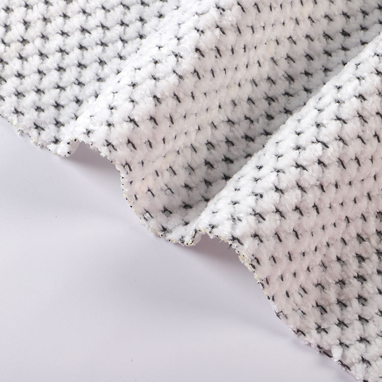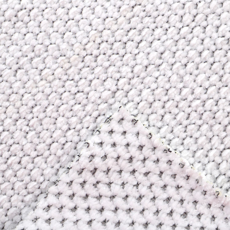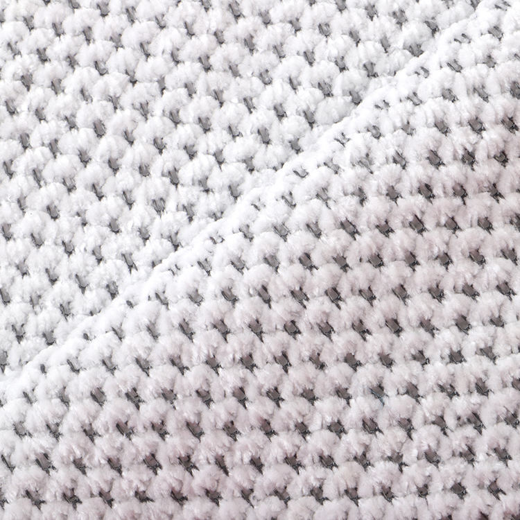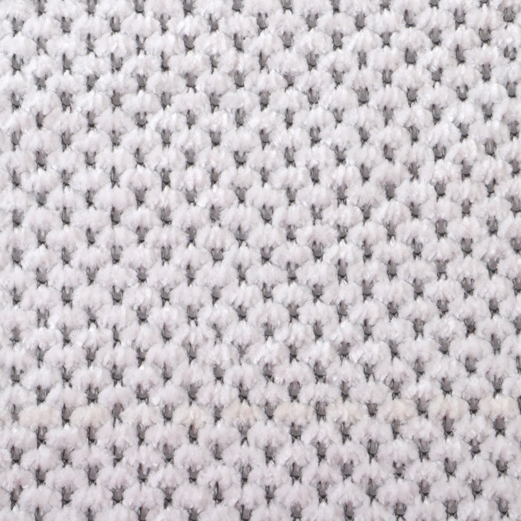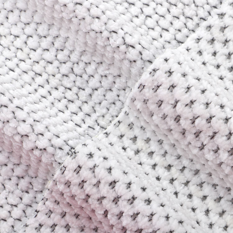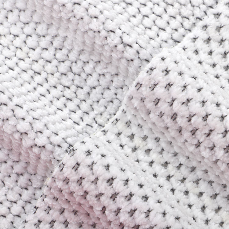 Chenille A# stof har en lav bunkehøjde på 1 mm, hvilket bidrager til dets slanke og sofistikerede udseende, mens det er let at rengøre og vedligeholde. Den strikkede teknik, der blev brugt i dens produktion, forbedrer stoffets styrke og levetid, hvilket gør det til et ideelt valg for tæpper og tæpper.